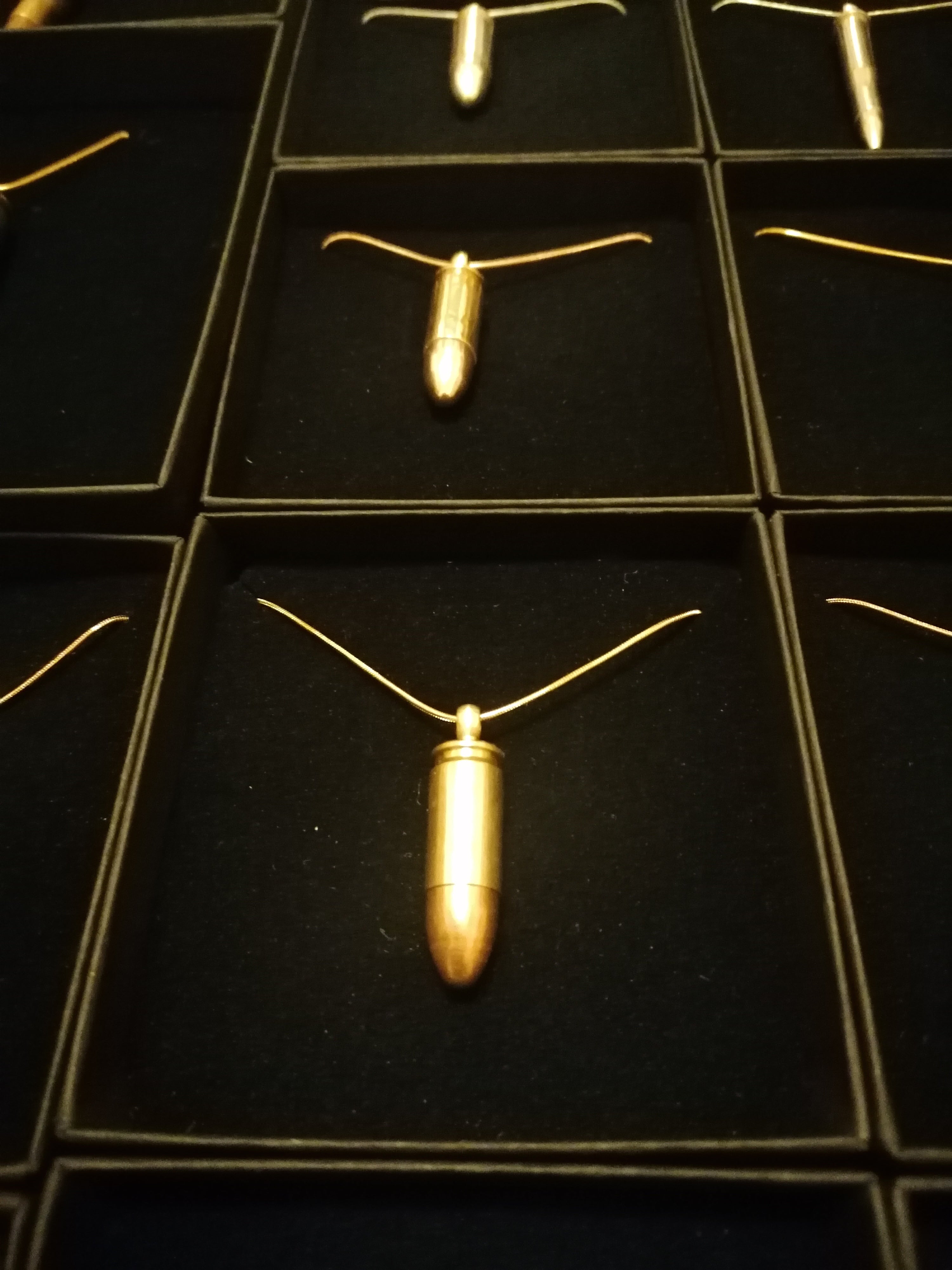 Die luxuriöse Halskette ist aus hochwertigem 304er Edelstahl gefertigt und verfügt über einen Anhänger aus einer echten 9mm Patrone. Wählen Sie zwischen vergoldeter oder versilberter Patrone. Auch mit Platinbeschichtung erhältlich.