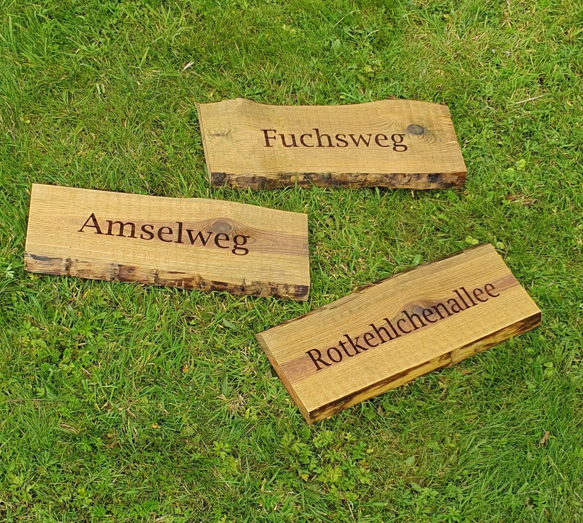Rustikales Holzschild, unbesäumt. Perfekt für die Beschilderung von Wegen und Pfaden, auch als Eingangsschild geeignet. Individuelle Beschriftung durch Lasergravur. Wetterfest beschichtet.